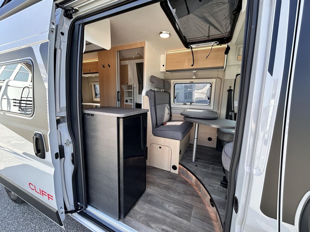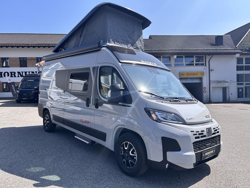- Cliff X Ausstattung 600 (Fiat Ducato 3.500 kg | 2.2 Multijet | 103 kW | 140 PS Euro 6 | 6-Gang-Schaltgetriebe, Fiat Weiß, Adventure Beklebung, Wohnwelt Adventure, LED Beleuchtung Dachschrank, Dachstauschrank Heck umlaufend, Skyview, Rahmenfenster, Variobad, Markise (schwarz), Panoramadachhaube 70 x 50 cm, Duschausstattung, Fenster im Bad, Kleiderstange in der Nasszelle, Breite Einstiegsstufe, Drehplatte für Tischerweiterung an der Sitzgruppe, Stoßfänger lackiert, Skid Plate Schwarz, Nebelscheinwerfer, Lenkrad & Schaltknauf in Lederausführung, Luftauslässe mit Applikationen Silber (Techno-Trim), 16" Alufelgen Bi-Color)