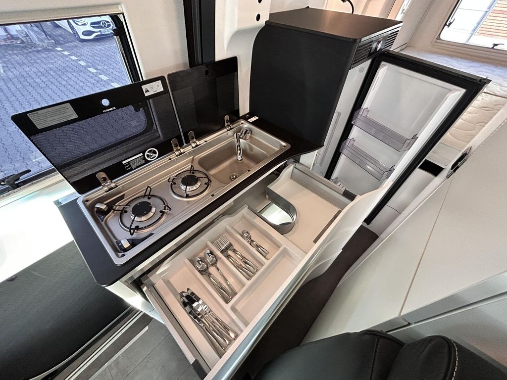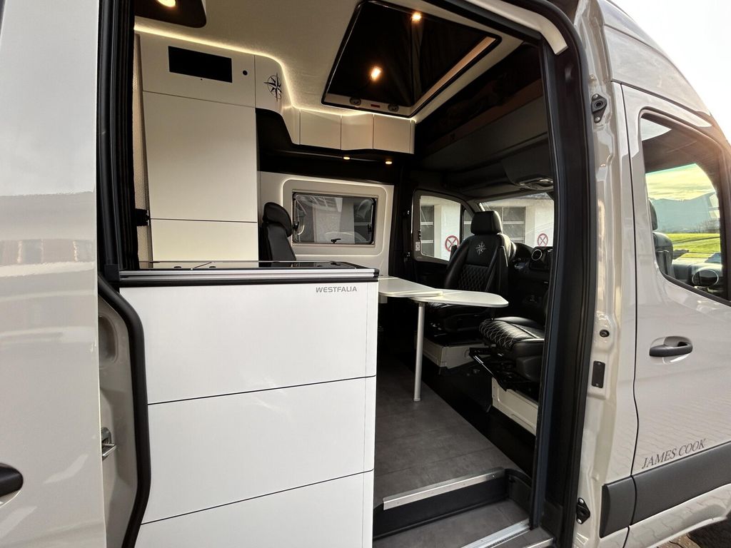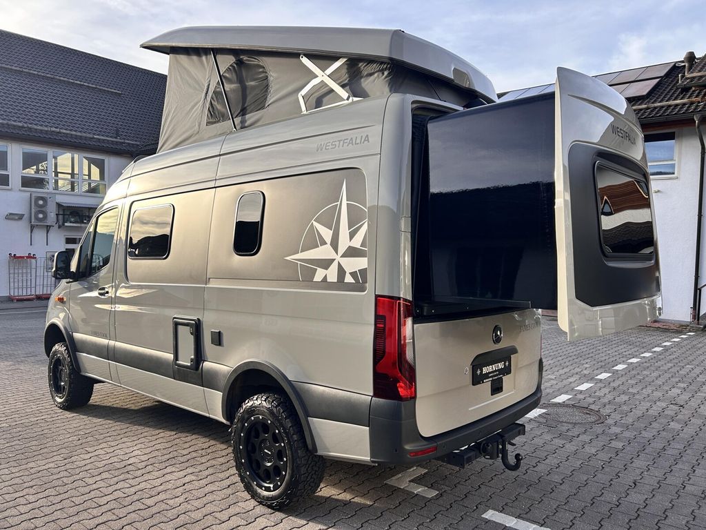 - Westfalia Plus Paket (93 l Kraftstofftank, Dimmbares LED Ambiente Lichtpaket: LED-Leuchtstreifen in den Dachstaukästen, LED-Leuchtstreifen an Lichtpanel Nasszelle und LED Regen-Licht Leiste (inkl. Dimmer und Fernbedienung), MBUX 10 Multimediasystem mit 10,25 Zoll Touchscreen, inkl. Navigation, Parkpaket mit Rückfahrkamera, Regensensor, Elektrische Zuziehhilfe Schiebetür rechts, Klimaanlage halbautomatisch geregelt TEMPMATIC, Fliegenschutztür, zweiteilig, Teppich Fahrerhaus, Loungefunktion Sitzbank, Außendusche warm / kalt inkl. Duschkopf und Saugfuß, Saugfußhalter für die Außennutzung des Tisches)